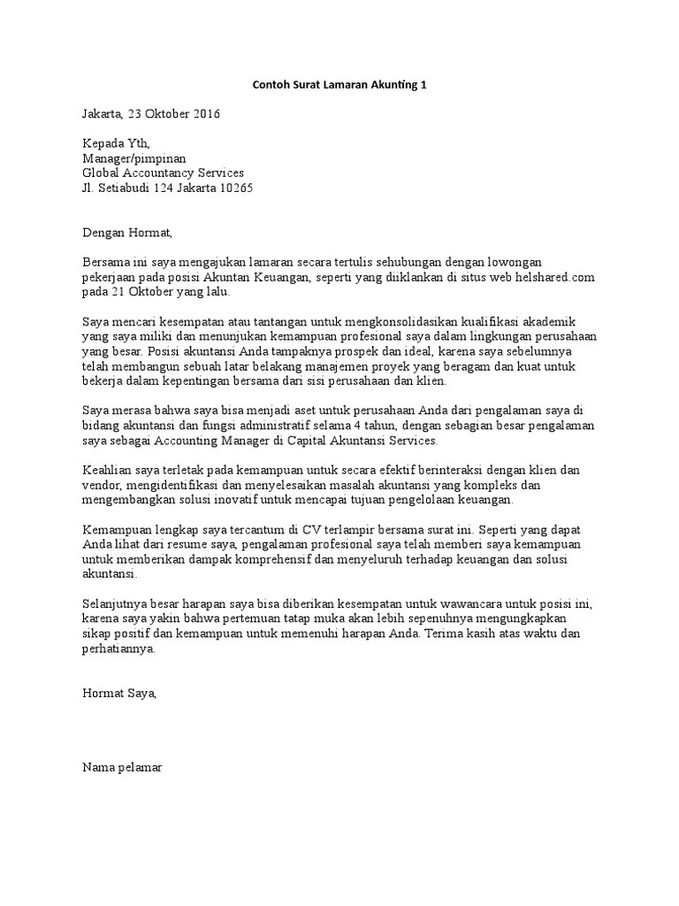 Bagi kamu yang ingin melamar sebagai. Contoh surat lamaran kerja untuk posisi accounting dan financejakarta, 20 desember 2006kepada yth, manajer sumber da. Contoh lamaran pekerjaan accounting dengan baik benar dan lengkap. Personel manager of pt fajar karya indah tbk. Contoh surat lamaran kerja untuk posisi accounting dan finance jakarta, 20 desember 2006 kepada yth, manajer sumber daya manusia pt. Contoh surat lamaran kerja bahasa inggris finance & accounting jakarta, may 27, 2011 attention: Berikut ini contoh surat lamaran kerja untuk posisi accounting dalam bahasa inggris beserta panduan memodifikasinya. Langsung saja kita simak pembahasan . Bedanya, kali ini lamaran pekerjaan akan dikhususkan untuk melamar pekerjaan dengan posisi accounting. Rincian contoh soal akuntansi untuk lamaran kerja. Untuk memenuhi permintaan dari beberapa pengunjung di situs kami berikut ini kami sampaikan 3 . Contoh surat lamaran pekerjaan akuntansi dalam bahasa inggris melamar pekerjaan di bidang akuntansi membutuhkan kecakapan dalam menghimpun serta . 3 contoh surat lamaran kerja staff accounting.
